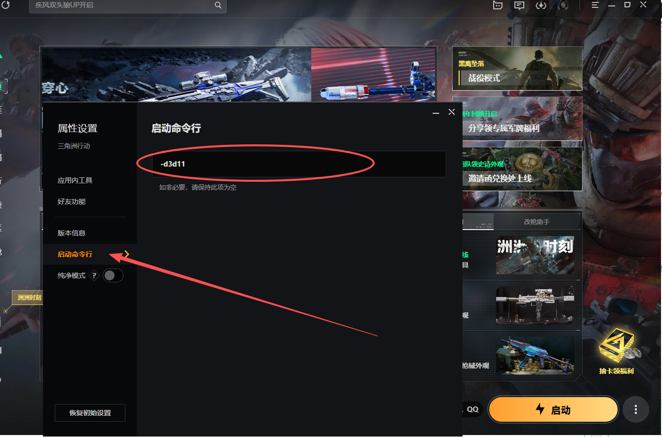 - 提前将游戏启动命令设置成 -d3d11 如下图